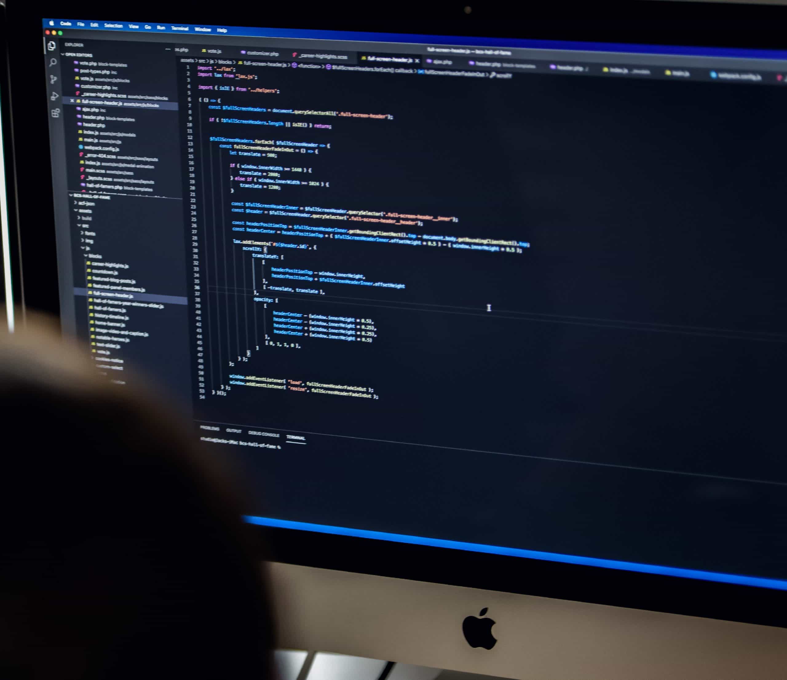 Now we add the joints that make your site move. For the majority of sites, plain javascript is our choice – commonly known as vanilla javascript. No bulky dependencies here adding unnecessary weight to your site and it’s dependable. It can be awkward to write, but unlike CSS, this is because of browser support. The newer generations of javascript (ES6), however, are great to work on, and we compile it down to something that’ll work in browsers using Babel.